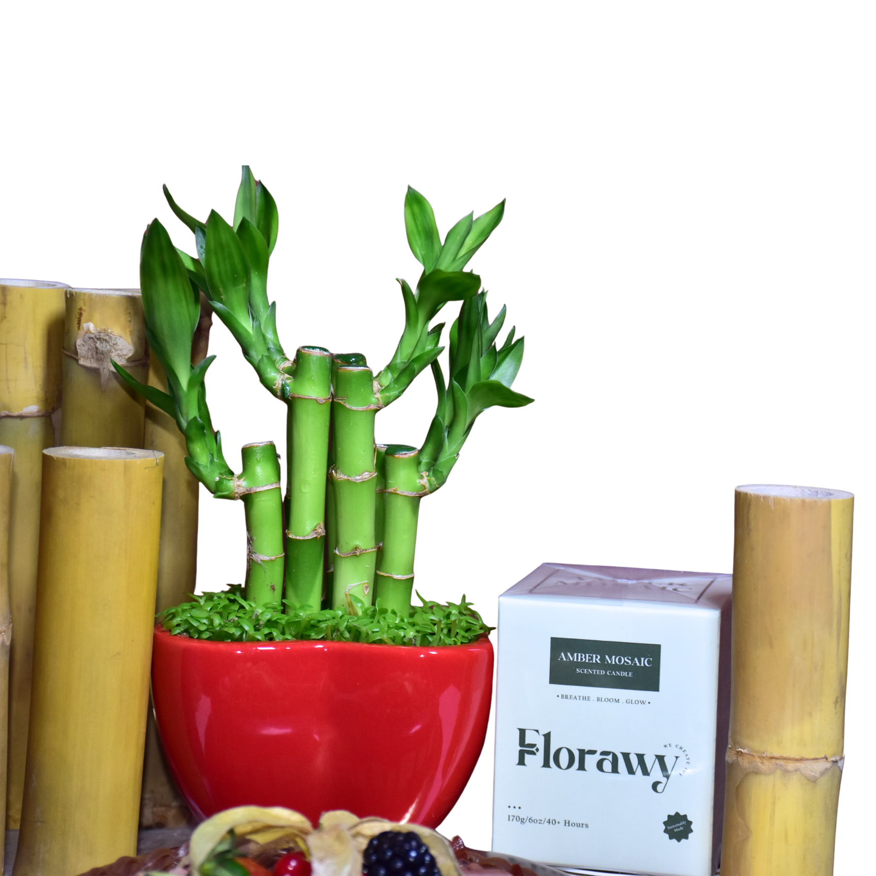 Celebrate birthdays with timeless elegance — a rich 1 kg chocolate cake, our signature Florawy Amber Mosaic candle, and a heart-shaped lucky bamboo plant beautifully curated for joyful beginnings.