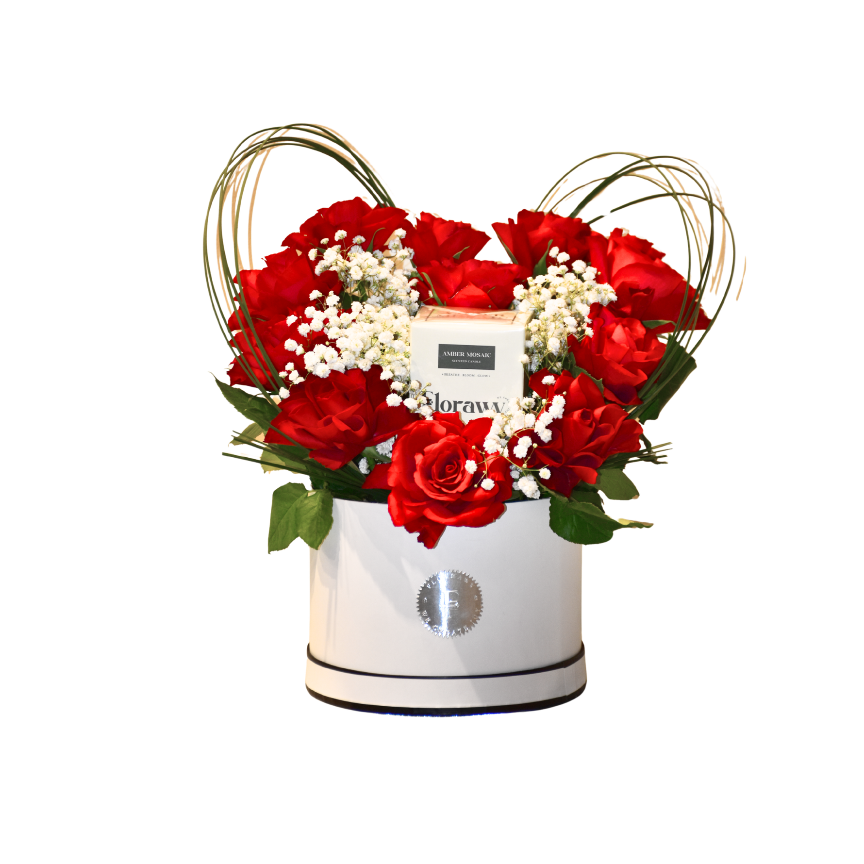 This luxury arrangement features premium red roses arranged in a heart-inspired silhouette, delicately framed with baby’s breath and elegant gold accents. Nestled within the design is a Florawy Signature Candle, designed to fill the room with warmth, elegance, and unforgettable emotion.