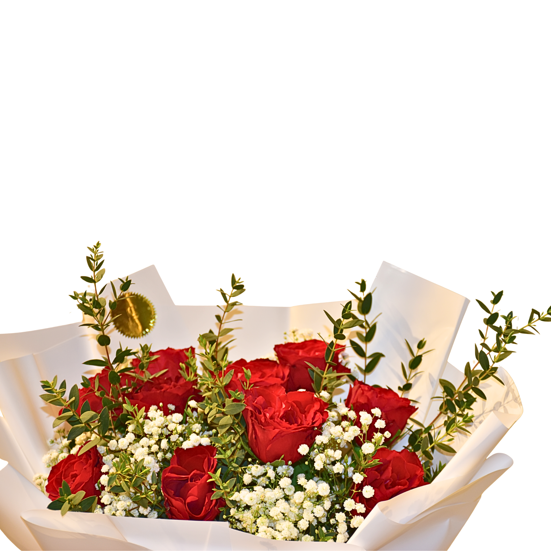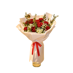 Featuring premium red roses delicately paired with baby’s breath and fresh seasonal greenery, this arrangement is wrapped in soft ivory-toned luxury paper and finished with a romantic red ribbon.