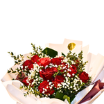Featuring premium red roses delicately paired with baby’s breath and fresh seasonal greenery, this bouquet is beautifully wrapped in soft layered paper and finished with a romantic red ribbon.
