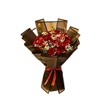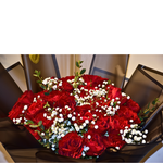 Featuring a dense cluster of premium red roses delicately accented with baby’s breath and fresh greenery, this arrangement is wrapped in dramatic matte dark-toned paper and finished with a romantic ribbon.